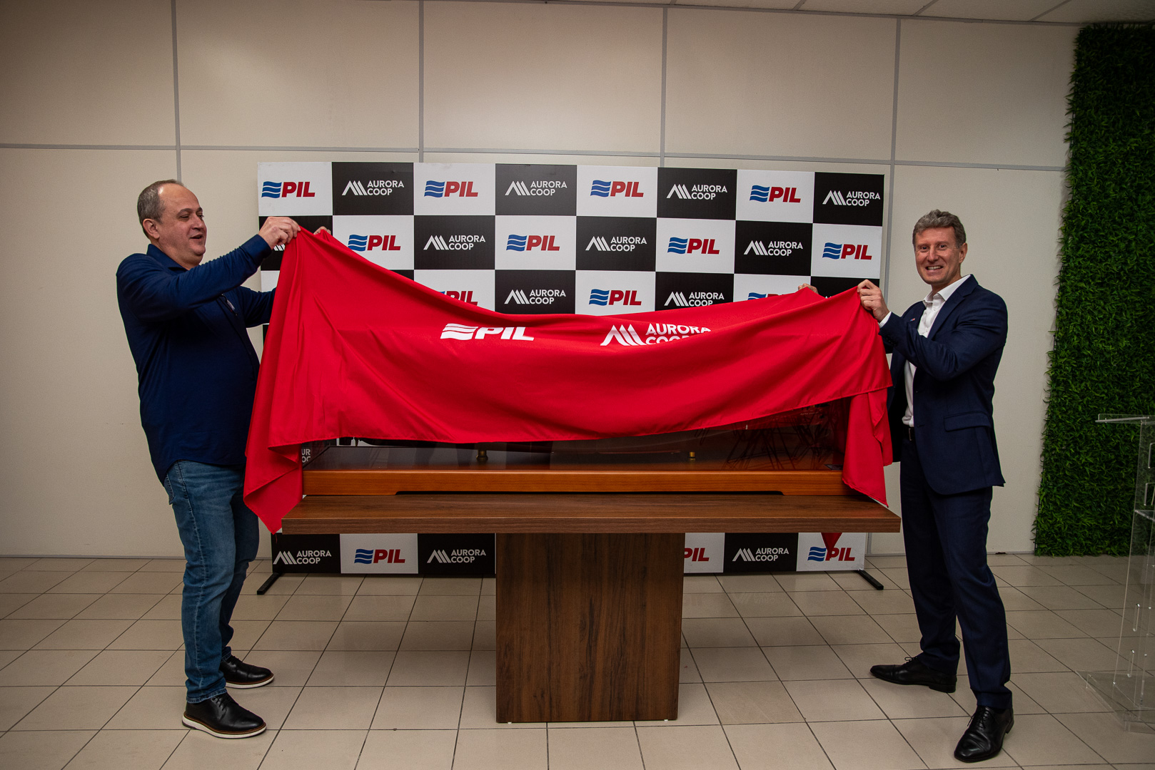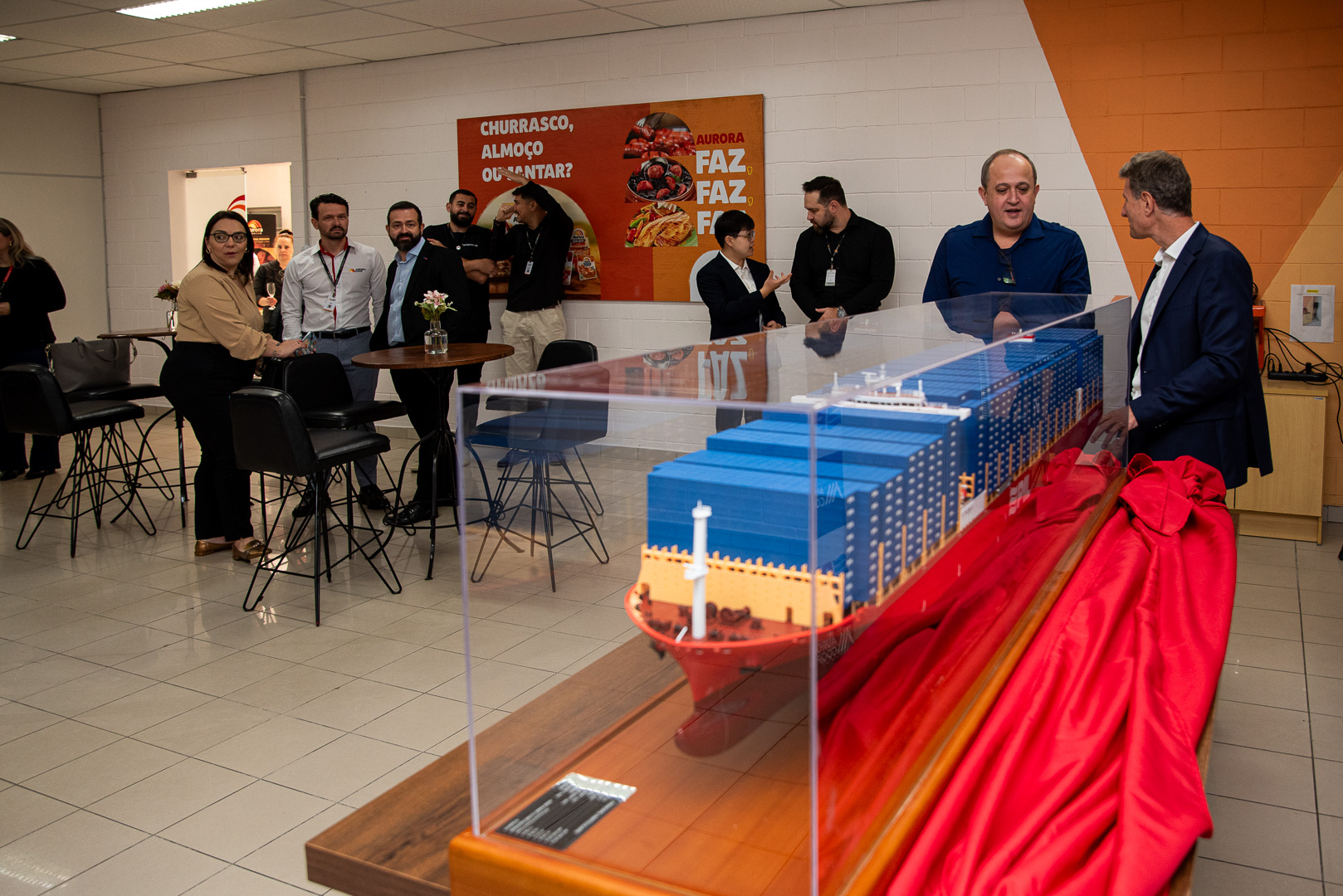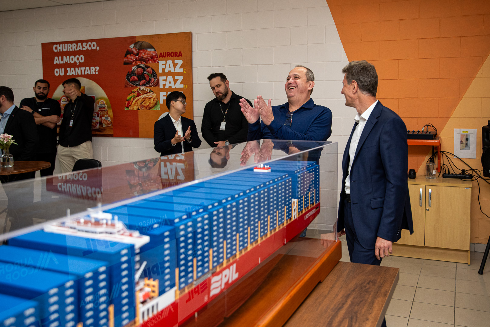 Com grande entusiasmo e orgulho, a Aurora Coop recebeu um presente do seu parceiro logístico Pacific International Lines (PIL): uma miniatura de um dos navios mais modernos da frota global da companhia, em escala 1:200. Para celebrar esse marco, foi realizado um evento exclusivo na Unidade Aurora Coop Itajaí. A cerimônia contou com a presença do líder da PIL na América Latina, Nicolas Romero, do nosso gerente de logística internacional, Jaison Cardoso, e demais colaboradores.