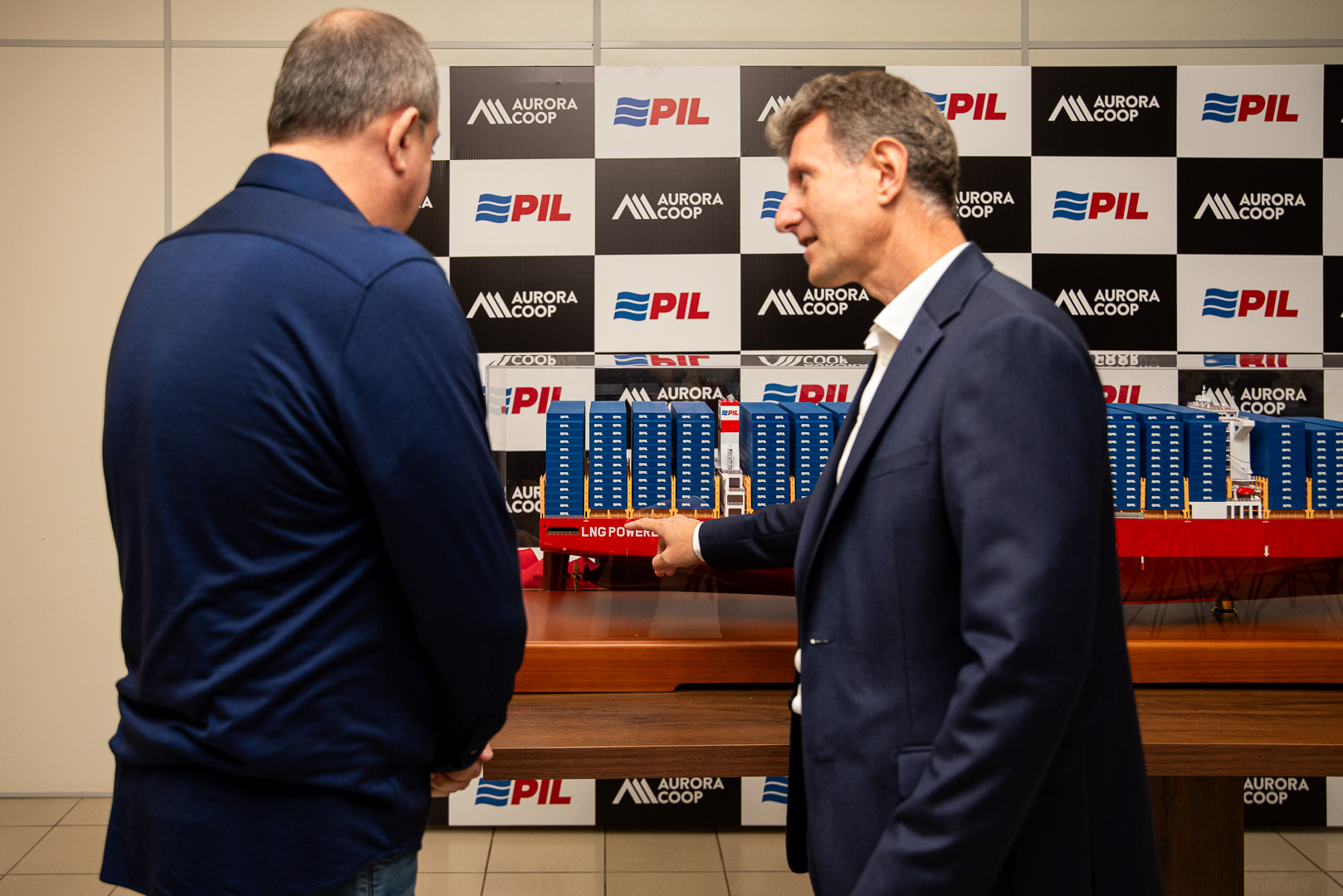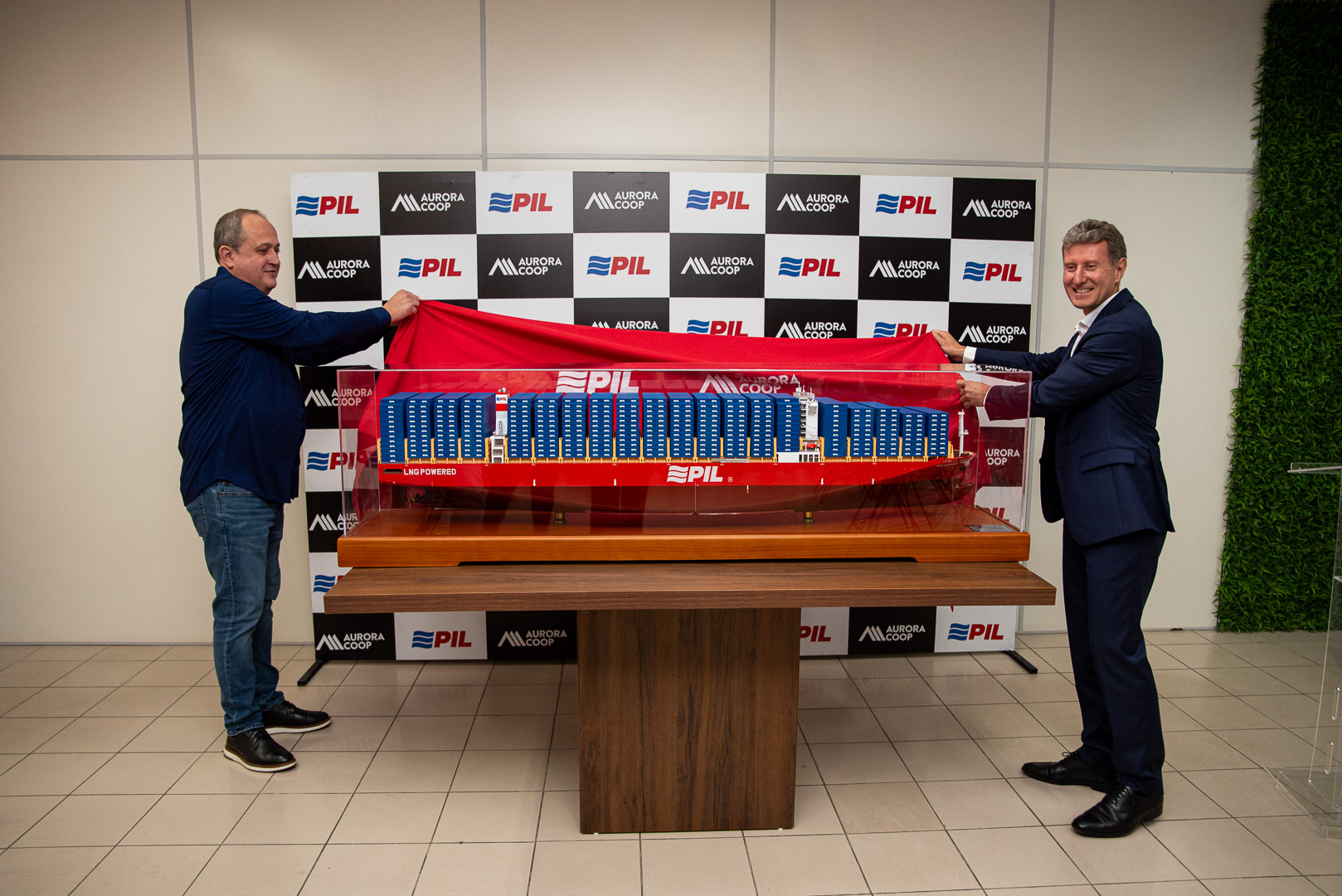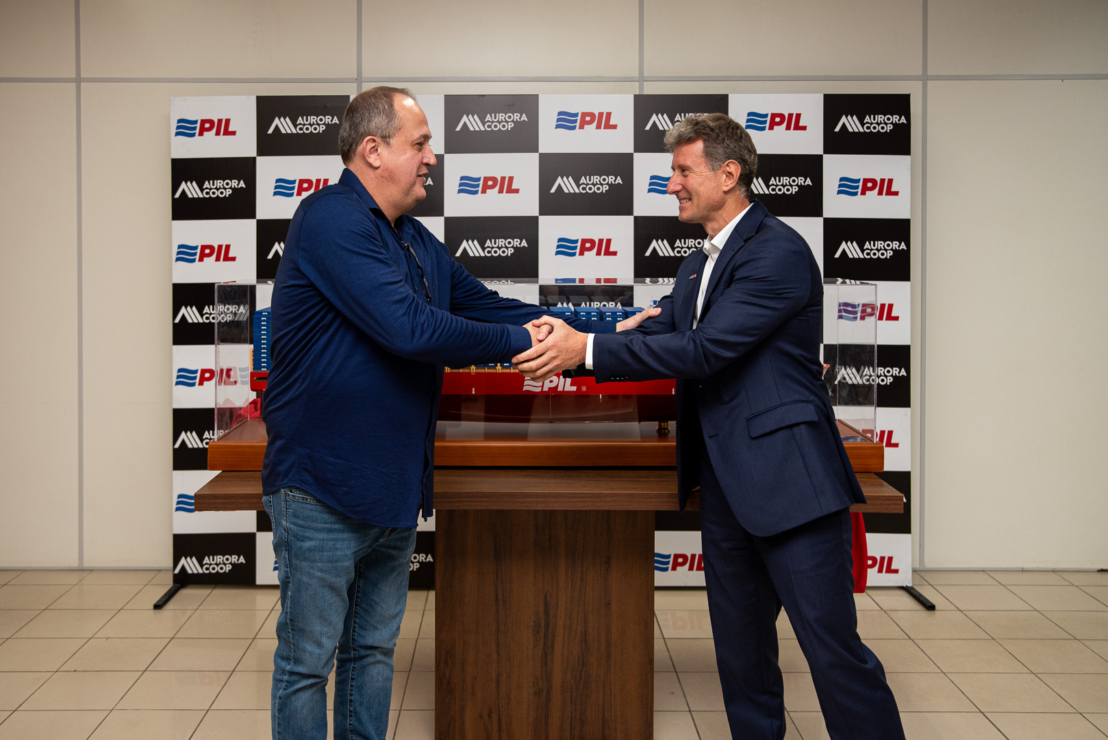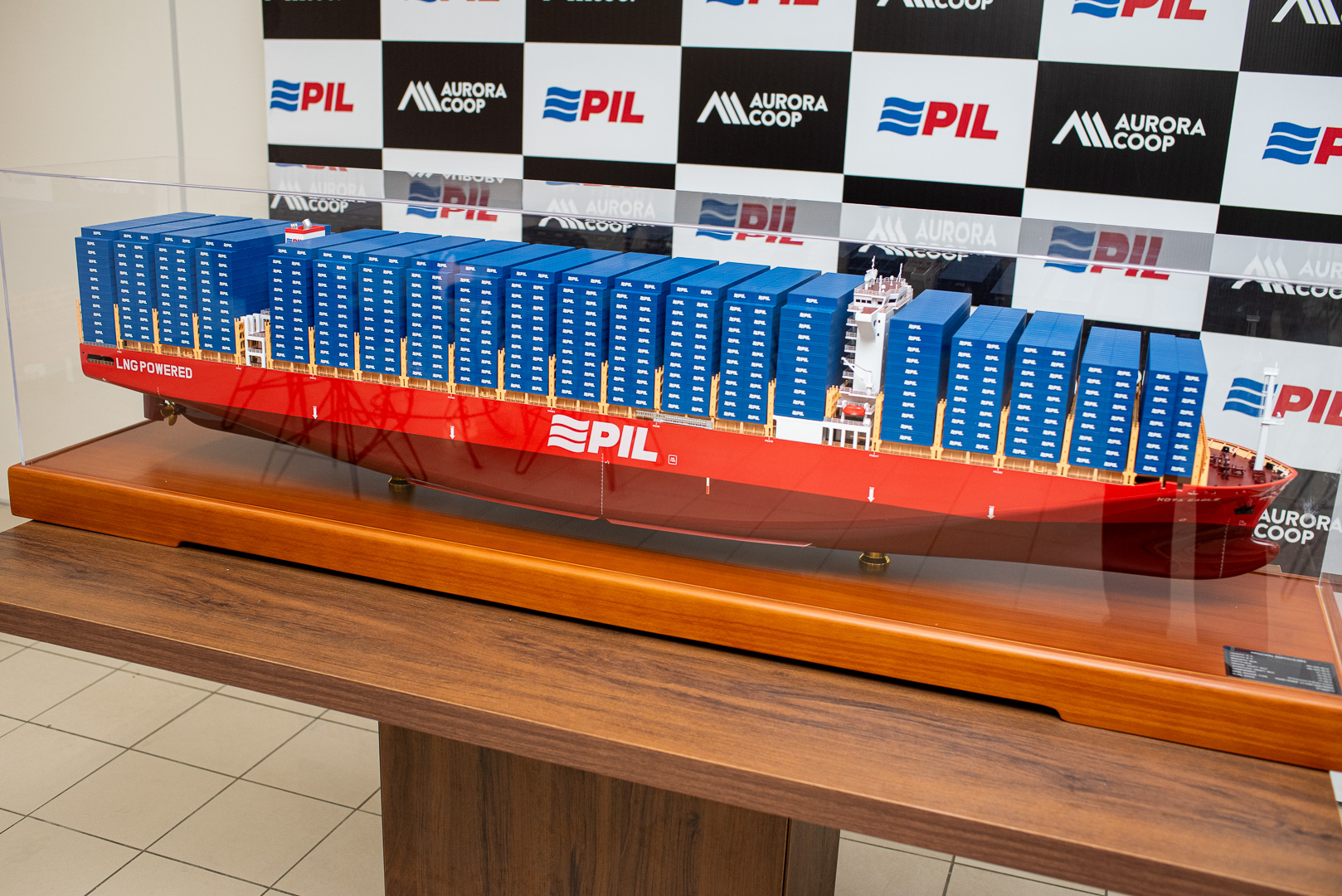 Com grande entusiasmo e orgulho, a Aurora Coop recebeu um presente do seu parceiro logístico Pacific International Lines (PIL): uma miniatura de um dos navios mais modernos da frota global da companhia, em escala 1:200.
