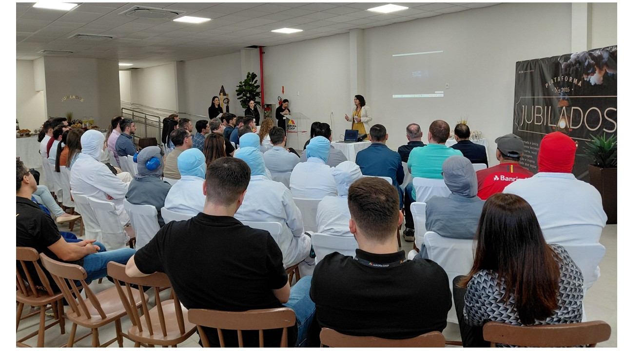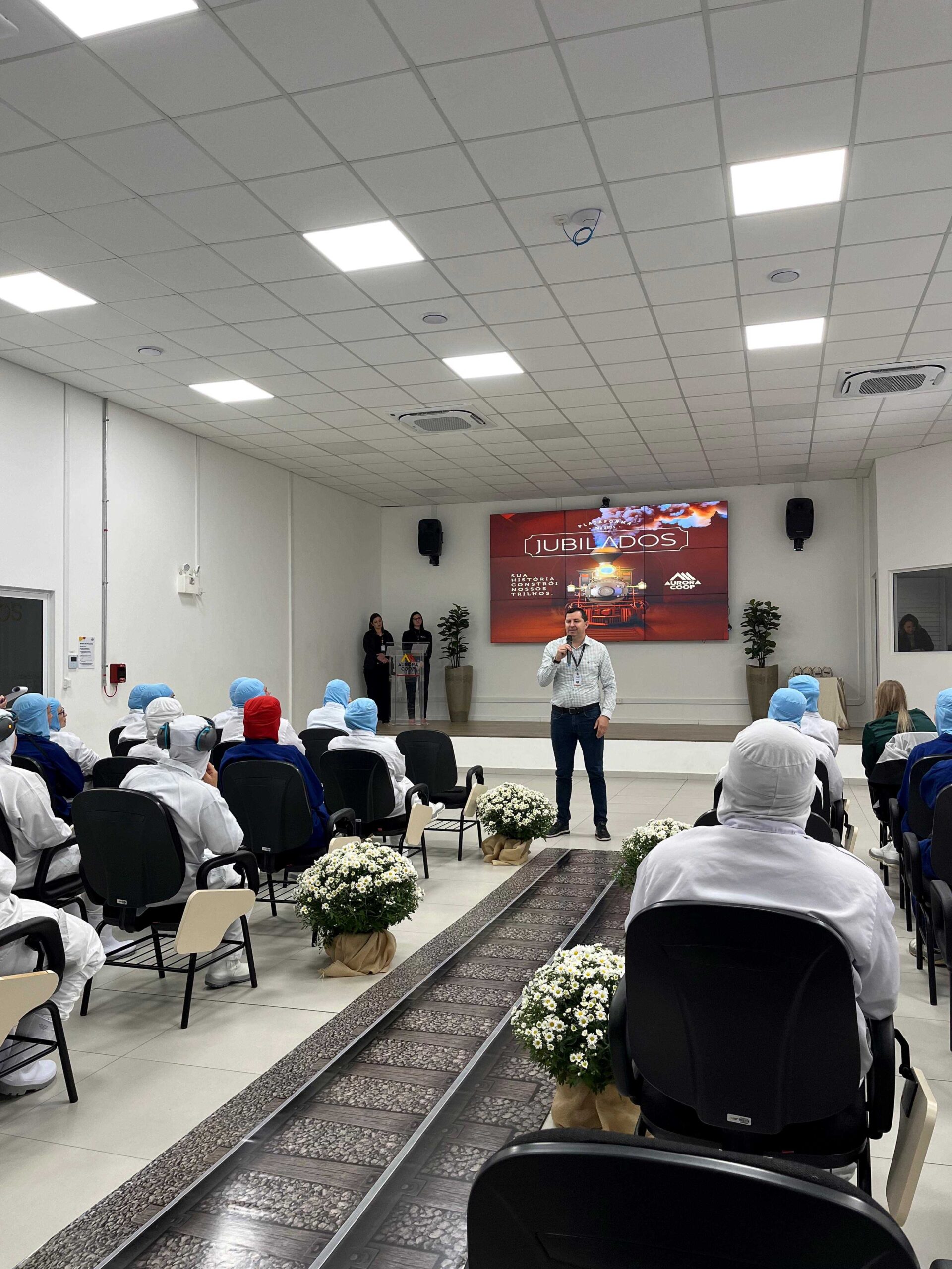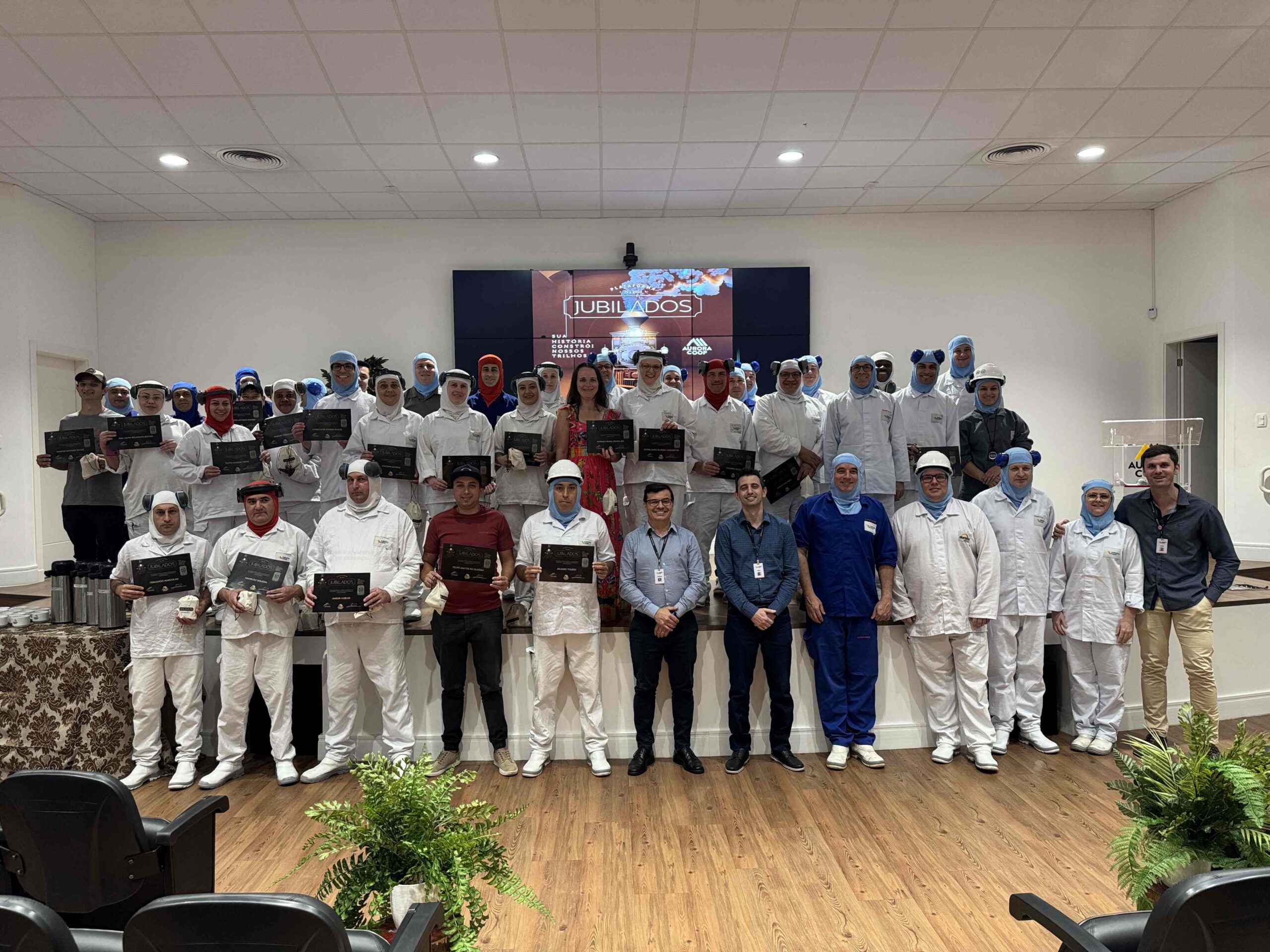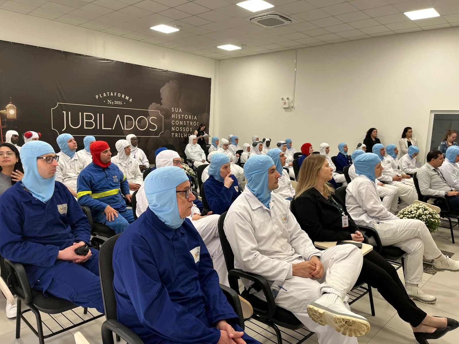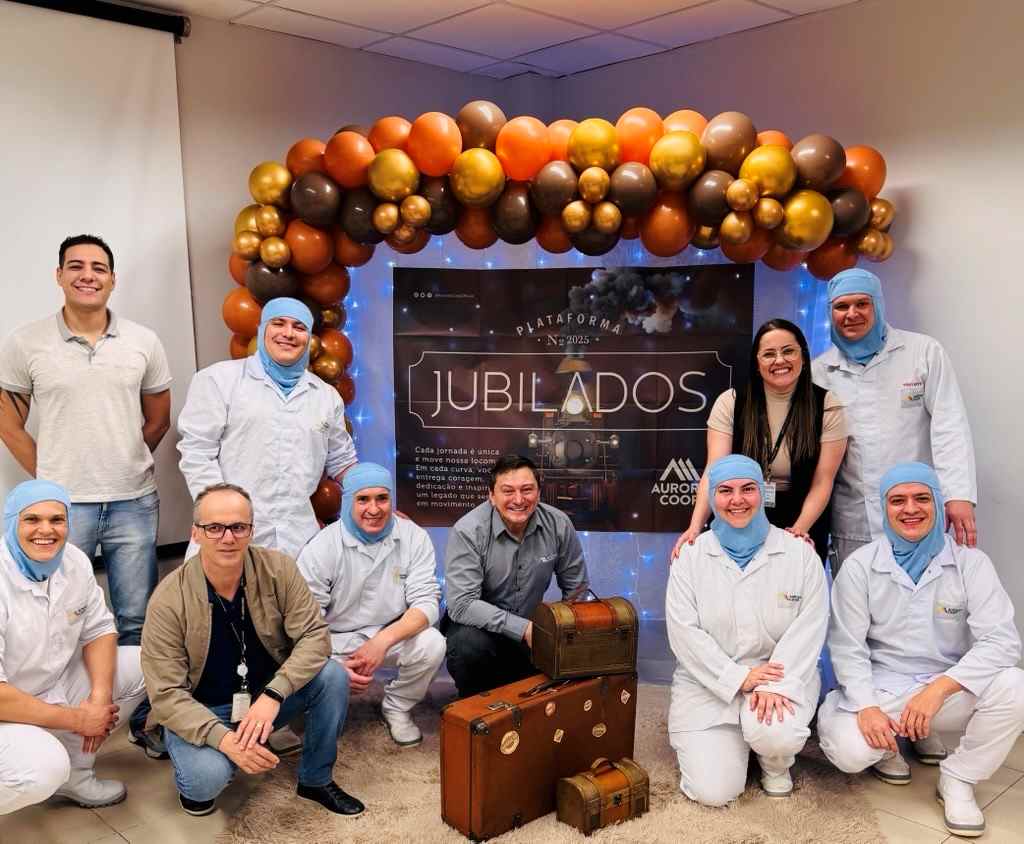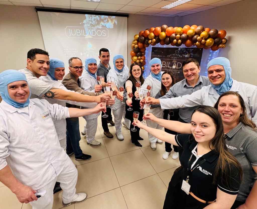 As homenagens também aconteceram em Erechim/RS (FAER I e FAER II), Guatambu/SC (FAG), Itajaí/SC, Joaçaba/SC (FAJO) e Mandaguari/PR (Fábrica de Rações e FAMA). Em Itajaí, a comemoração foi ainda mais comovente com a participação online do jubilado e supervisor administrativo da Aurora Coop Shangai, Dhanvantari da Silva Stuani. Nas unidades de Mandaguari foi feito um evento único, que uniu os mais de 300 jubilados da fábrica e do frigorífico para celebrar o momento pela primeira vez – em 2025 as unidades também completaram 10 anos de história.