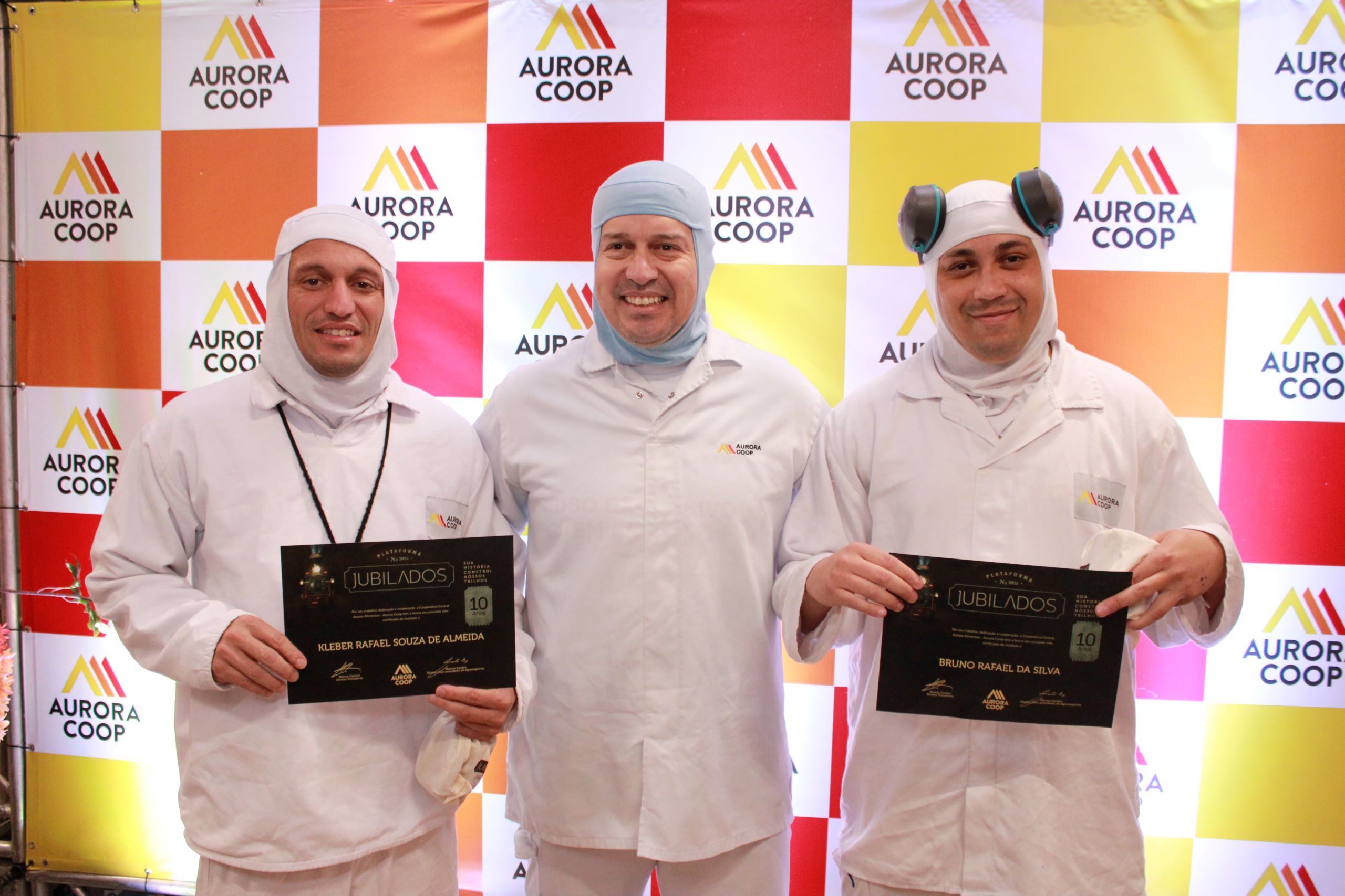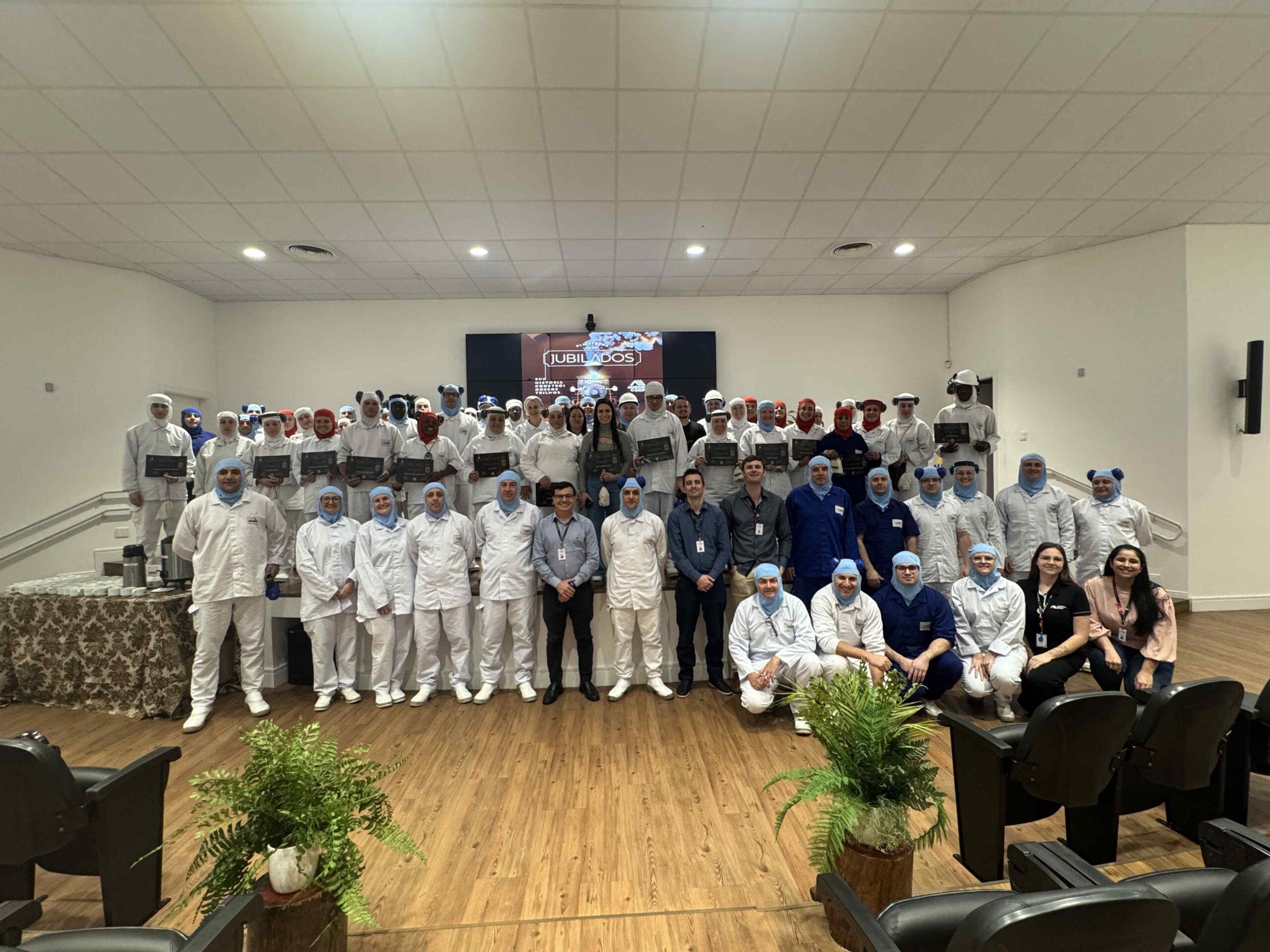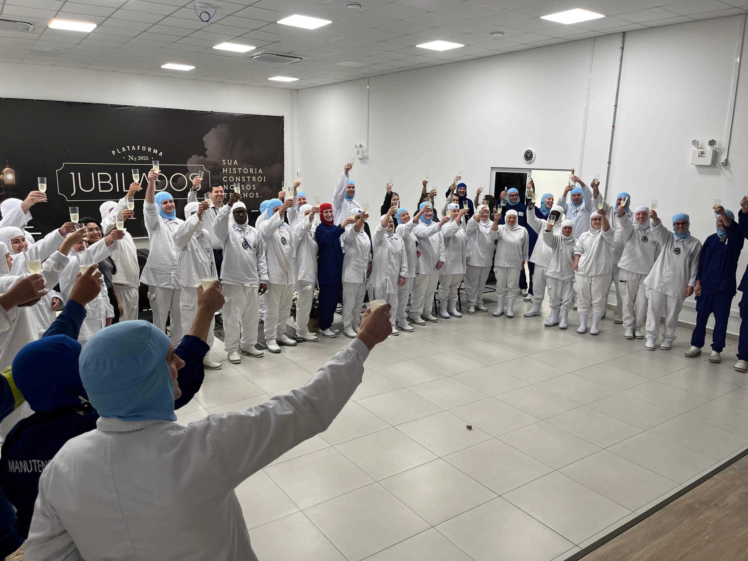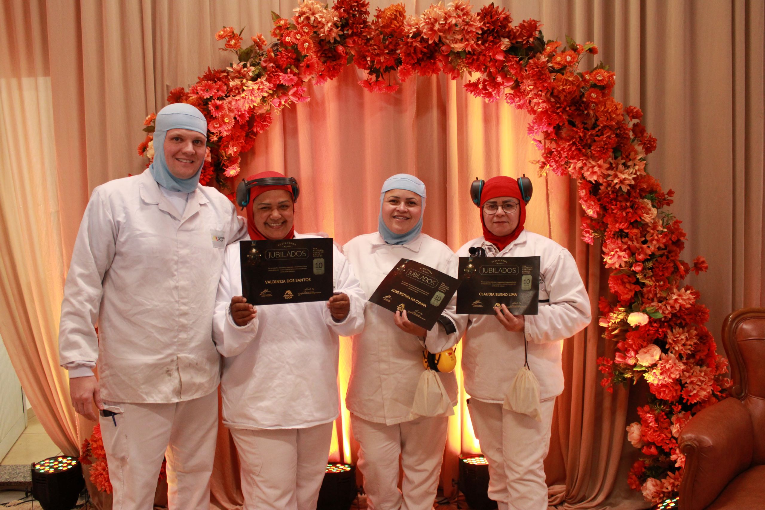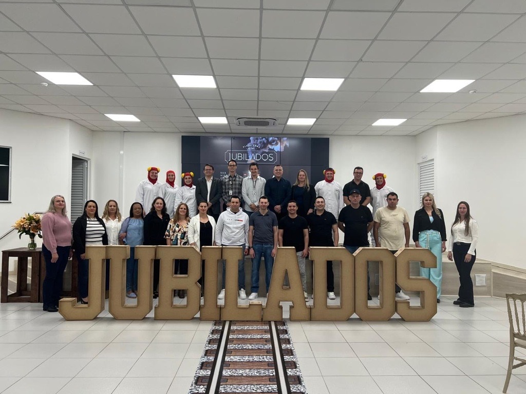 As homenagens também aconteceram em Erechim/RS (FAER I e FAER II), Guatambu/SC (FAG), Itajaí/SC, Joaçaba/SC (FAJO) e Mandaguari/PR (Fábrica de Rações e FAMA). Em Itajaí, a comemoração foi ainda mais comovente com a participação online do jubilado e supervisor administrativo da Aurora Coop Shangai, Dhanvantari da Silva Stuani. Nas unidades de Mandaguari foi feito um evento único, que uniu os mais de 300 jubilados da fábrica e do frigorífico para celebrar o momento pela primeira vez – em 2025 as unidades também completaram 10 anos de história.