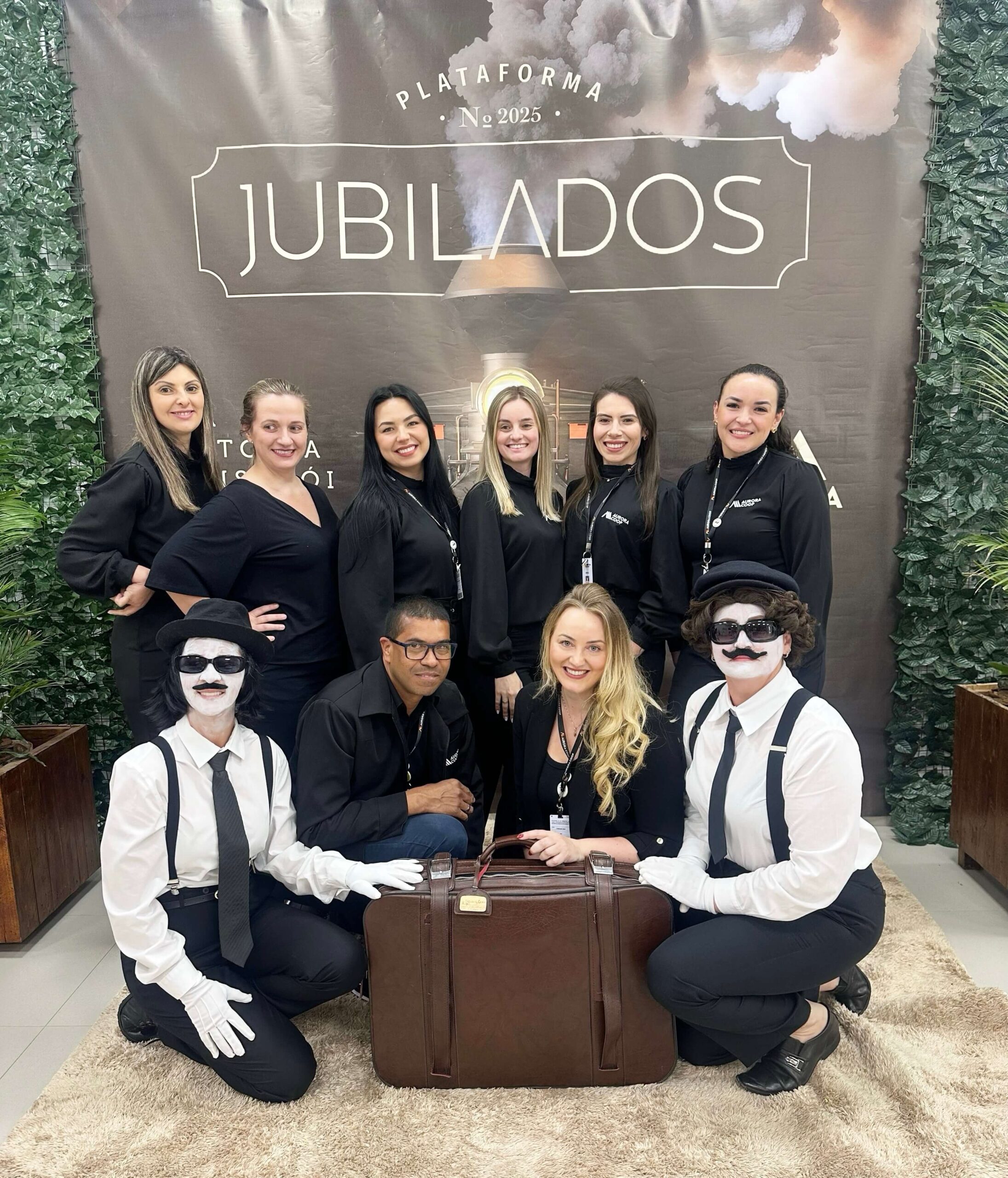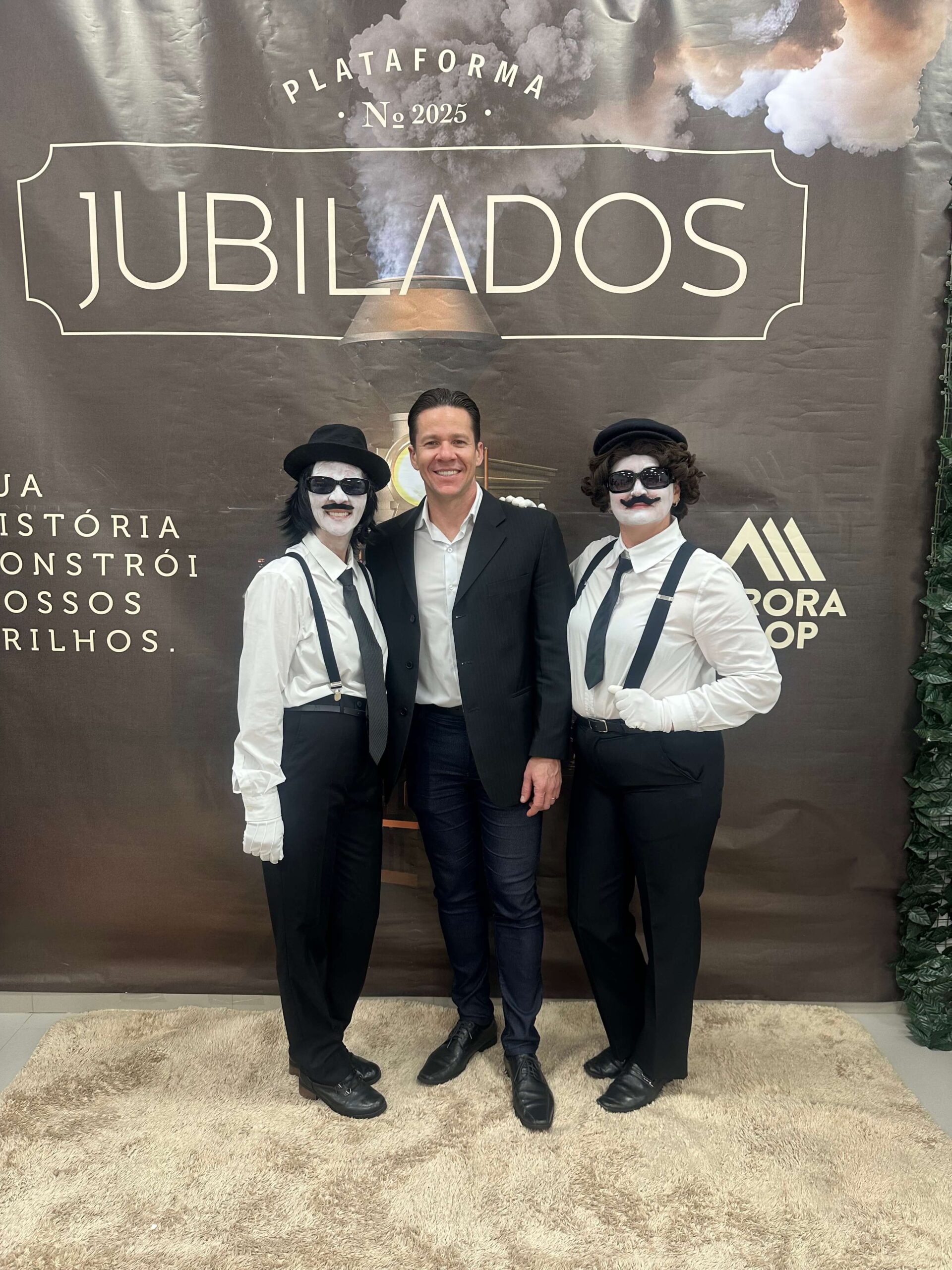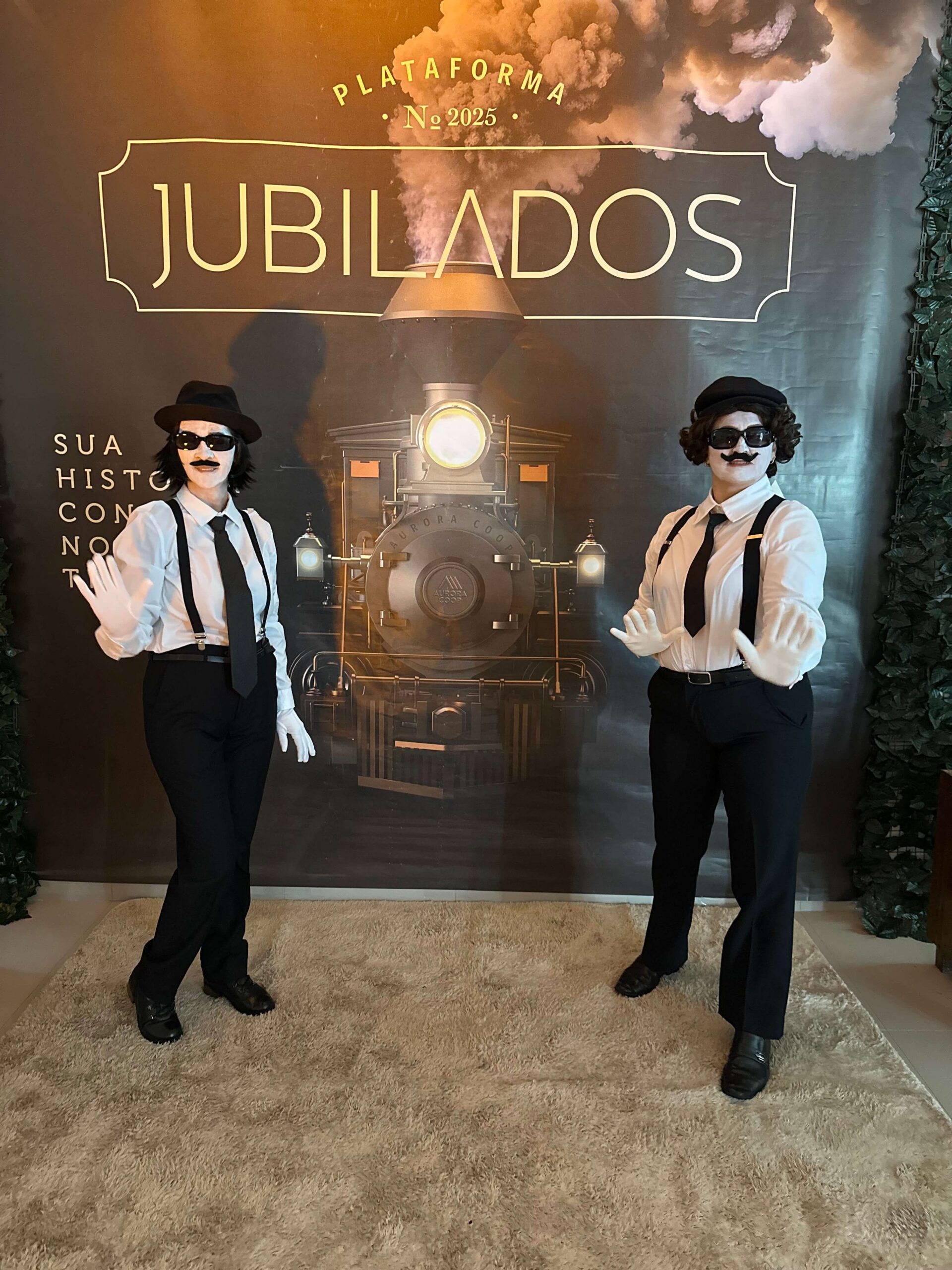 Os jubilados foram recepcionados por colegas voluntárias vestidas de maquinistas, que conduziram eles na passarela ao receber o certificado e o brinde.