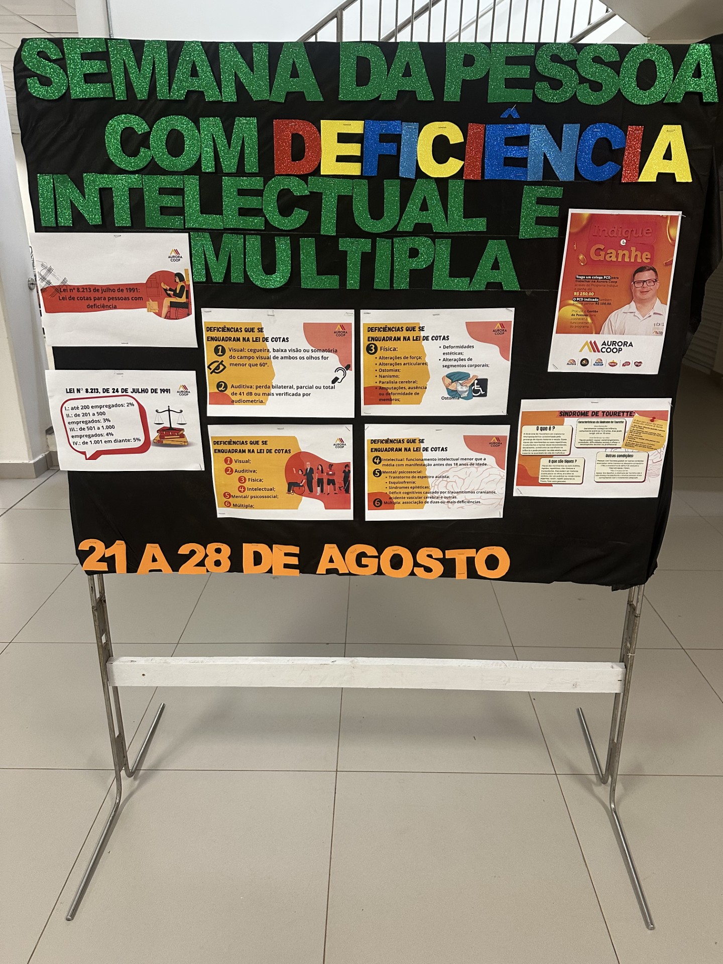 Exposição de um mural informativo sobre os tipos de deficiência e a promoção da Aurora “indique uma pessoa com deficiência para trabalhar”.