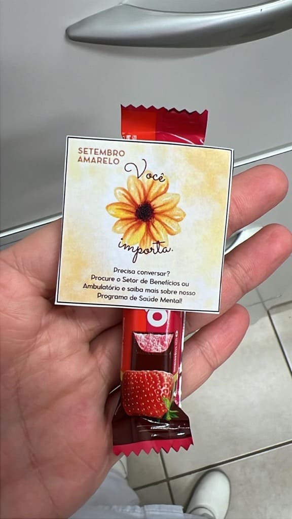 No dia 26/09, durante o almoço e jantar servidos na unidade, todos os colaboradores receberam uma sobremesa especial acompanhada de um recadinho com a frase “Você importa”. A ação teve como objetivo reforçar, de forma simples e afetiva, a importância de cada pessoa no ambiente de trabalho e lembrar que há apoio disponível para quem precisa. Os recadinhos também sinalizavam os canais de ajuda da unidade, fortalecendo a rede de apoio emocional.