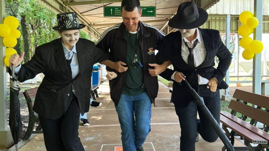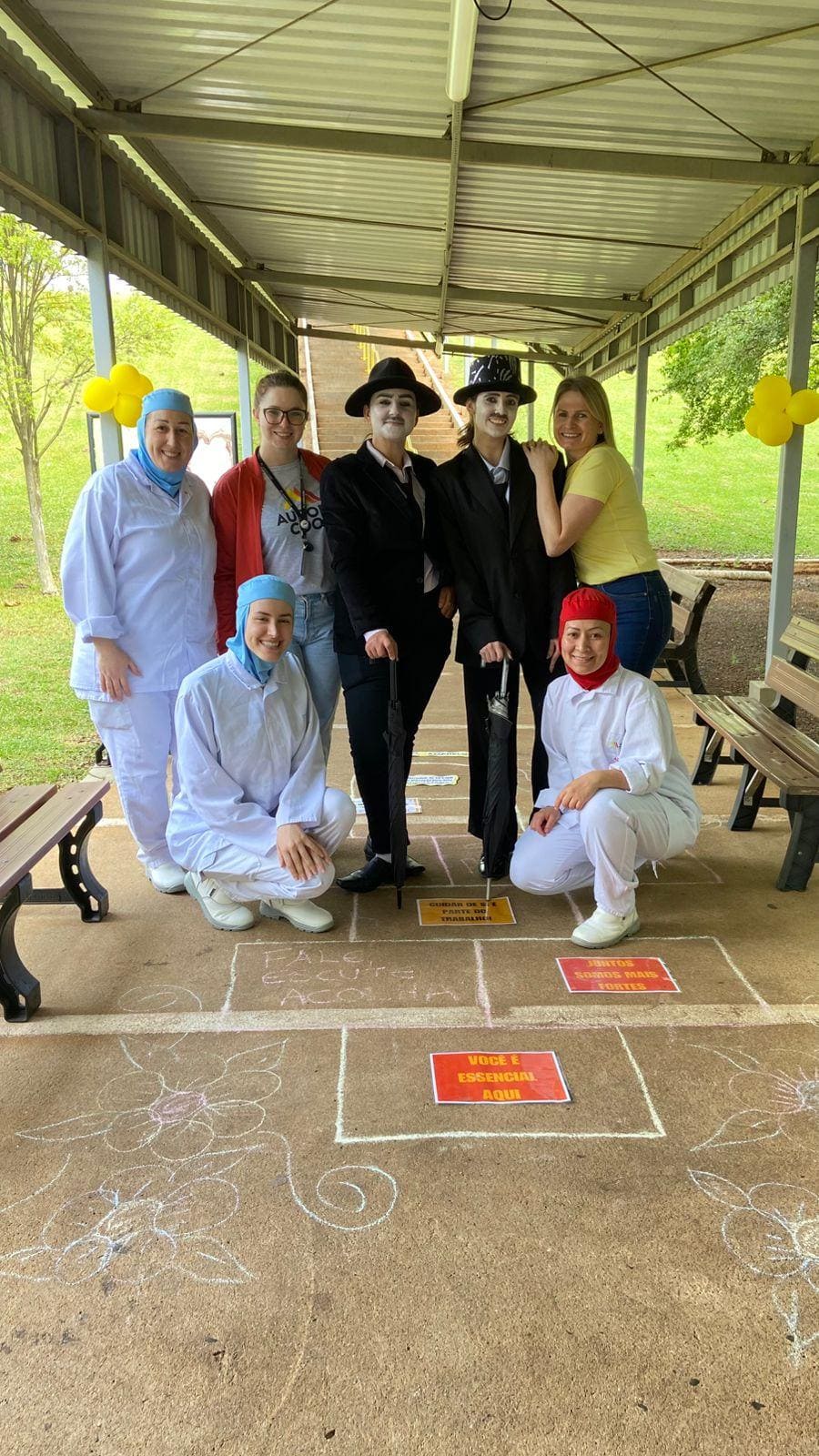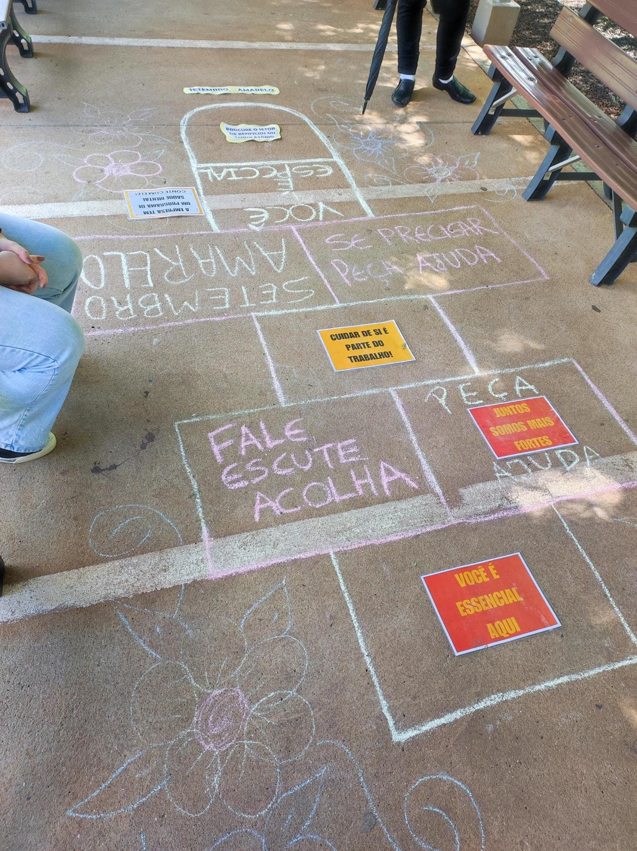 Na troca de turno do dia 16/09, os colaboradores foram convidados a participar de uma amarelinha temática, com frases motivadoras que incentivavam o autocuidado e o diálogo, como: