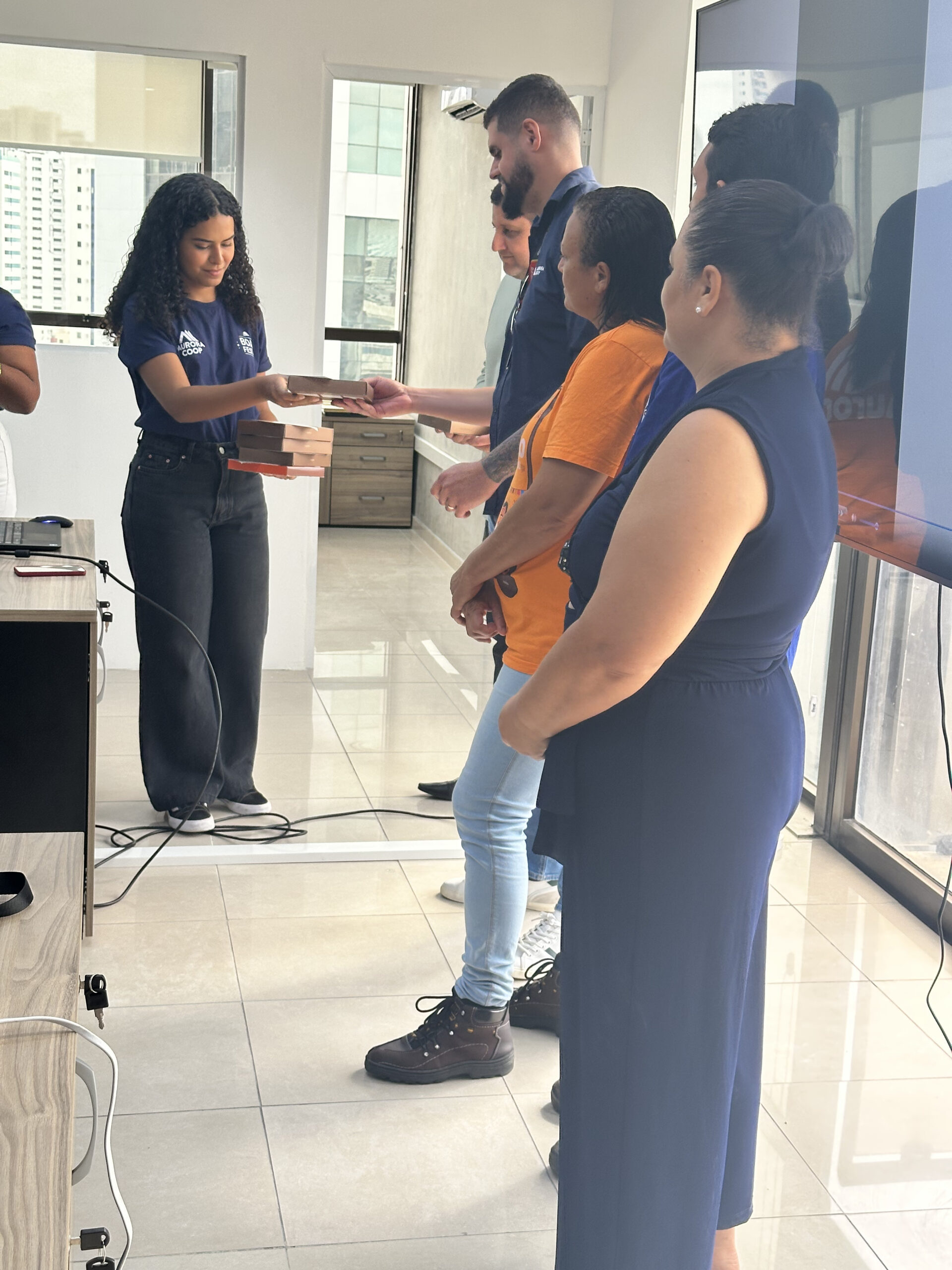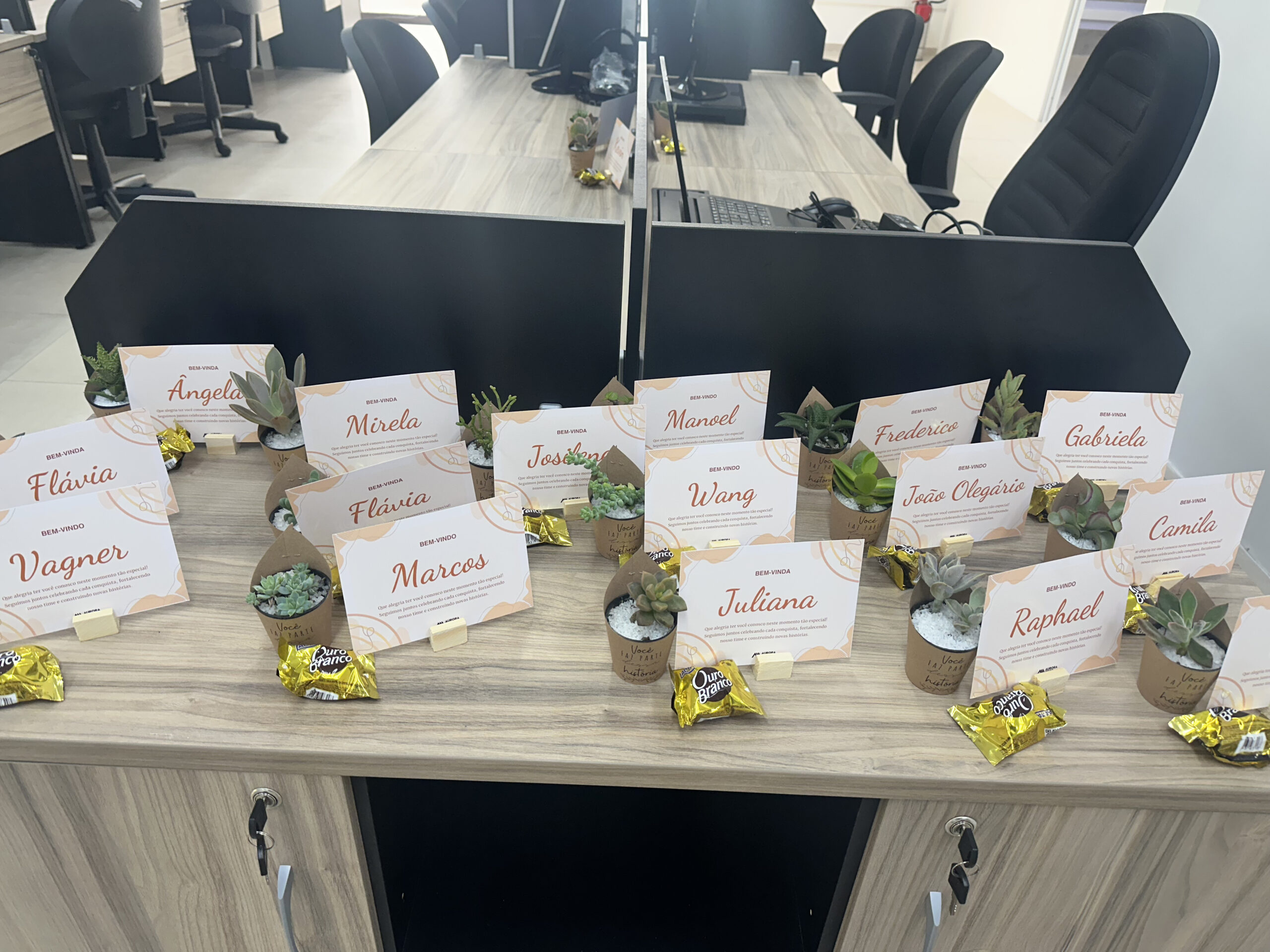 A recepção foi promovida pela área de gestão de pessoas, que organizou um momento especial de boas-vindas: em cada mesa, os colaboradores encontraram um cartão personalizado com seu nome e uma mensagem, uma muda de suculenta como símbolo de crescimento e um chocolate.