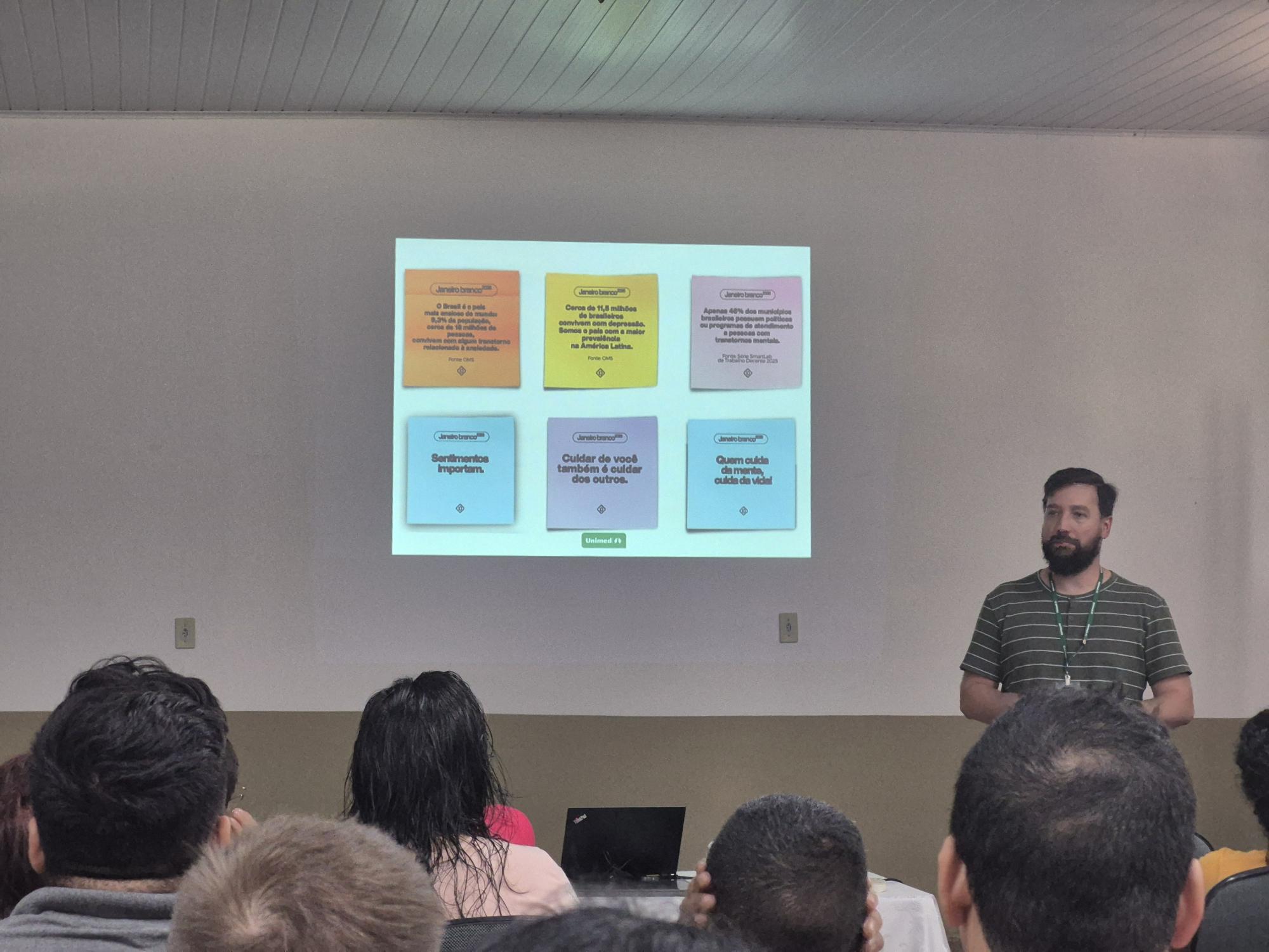 As Unidades de Vendas Aurora Coop Rio de Janeiro e a Unidade de Cariacica/ES se uniram para a conscientização dos colaboradores sobre saúde mental. A ação aconteceu em formato híbrido, com transmissão on-line e participação presencial, possibilitando alcançar um público amplo e diverso. Ao todo, 153 pessoas participaram do encontro, demonstrando engajamento e interesse em um tema cada vez mais essencial para a vida pessoal e profissional. A palestra foi conduzida pela psicóloga e neuropsicóloga da Unimed Chapecó, Taísa Colombelli, que trouxe reflexões importantes sobre o equilíbrio emocional e o reconhecimento dos próprios limites. Durante o encontro, também foi reforçado a importância do apoio profissional, seja por meio da psicologia, psiquiatria ou neuropsicologia, além da divulgação de canais de atendimento em situações de crise.