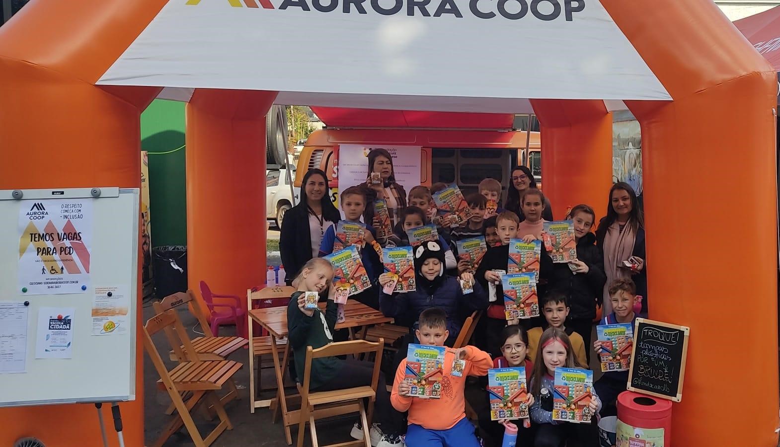 De 10 a 12 de julho, os voluntários da Fábrica de Rações Aurora Coop Cunha Porã, juntamente com a Fundação Aury Luiz Bodanese, participaram da 2ª edição da Agrocunha, a Feira de Agronegócios, que foi realizada na Praça Central do município. O estande contou com a kombi da Fundação, com apresentação e entrega dos materiais do Programa Turminha da Reciclagem e promoveu a troca de tampinhas plásticas, através do Programa Tampinha Voluntária, por brindes especiais. Mais de 10kg de tampinhas foram arrecadados.